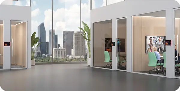 أصبح التحقق من توفر غرف الاجتماعات أسهل من أي وقت مضى بفضل أشرطة LED كاملة الألوان (RGB) عالية الوضوح. تُظهر هذه الأضواء المنحنية على الجانبين ألوانًا مختلفة تعبّر عن حالة الغرفة، مما يتيح رؤية واضحة من أي زاوية.