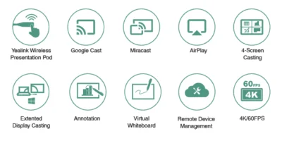 يسمح يالينك RoomCast للمشاركين بإرسال شاشاتهم إلى جهاز تلفزيون في وقت واحد من خلال يالينك WPP20 وMiracast وAirPlay وGoogle Cast، واستخدام ميزات التعاون التفاعلية.