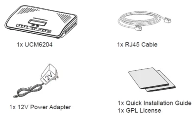 1× UCM6204 1 × كابل RJ45 1 × محول طاقة 12 فولت 1 × دليل التثبيت السريع 1× رخصة GPL